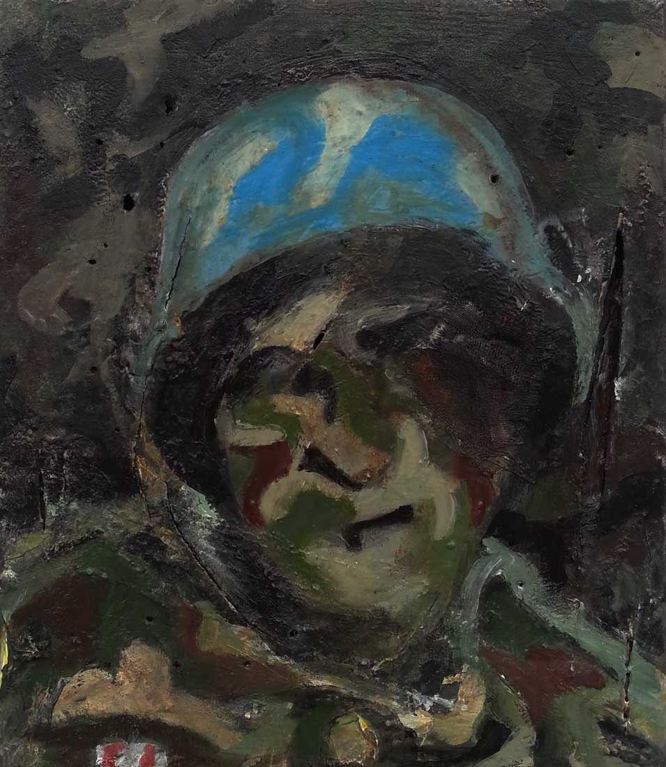 On the wall you see an image of a group of soldiers who are infected with chlorine. They hold on to each other’s shoulder and have a piece of cloth before their eyes.