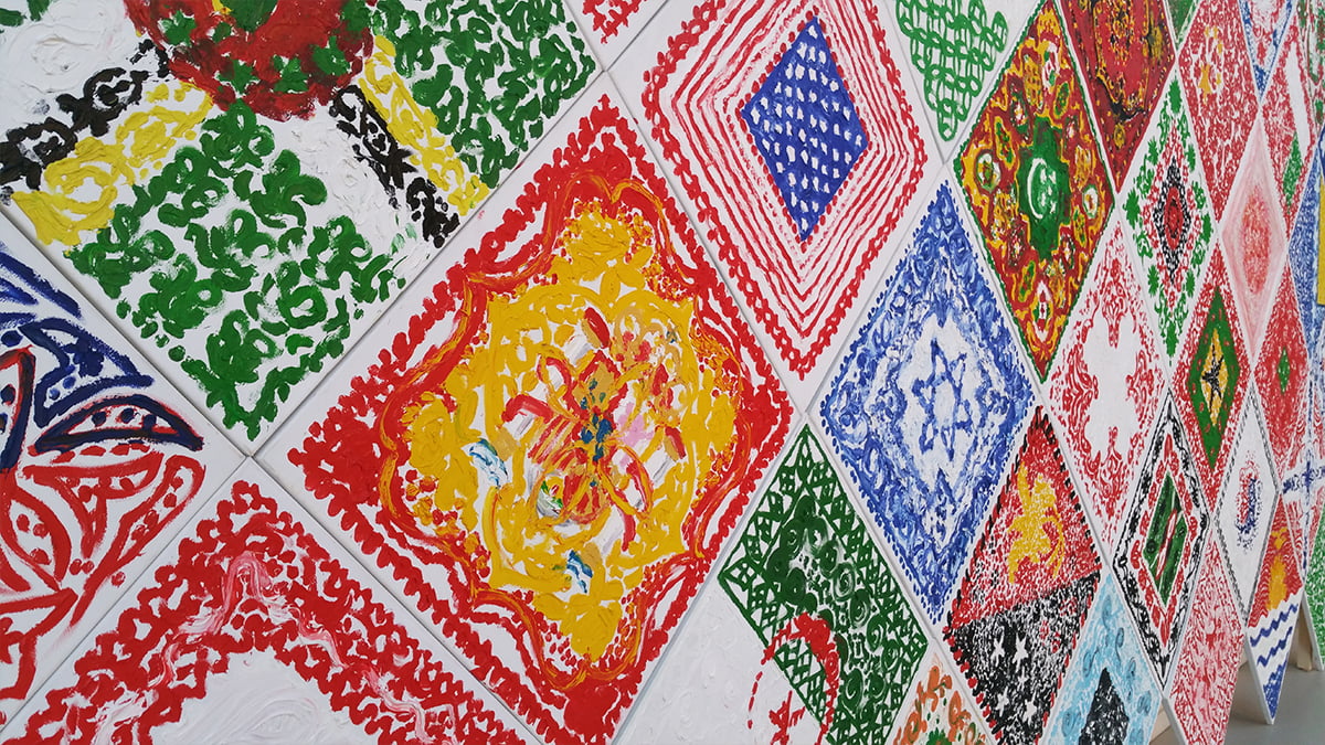 Flags of the World started in 2010. The Dutch ‘boerenzakdoek’ (literally = farmers + handkerchief) is de basis. With this piece of folk I made a link to the flags of all the countries of the world. All canvases are 60 x 60 cm and painted with my fingers. Looking along the wall it looks like one carpet of oil paint.